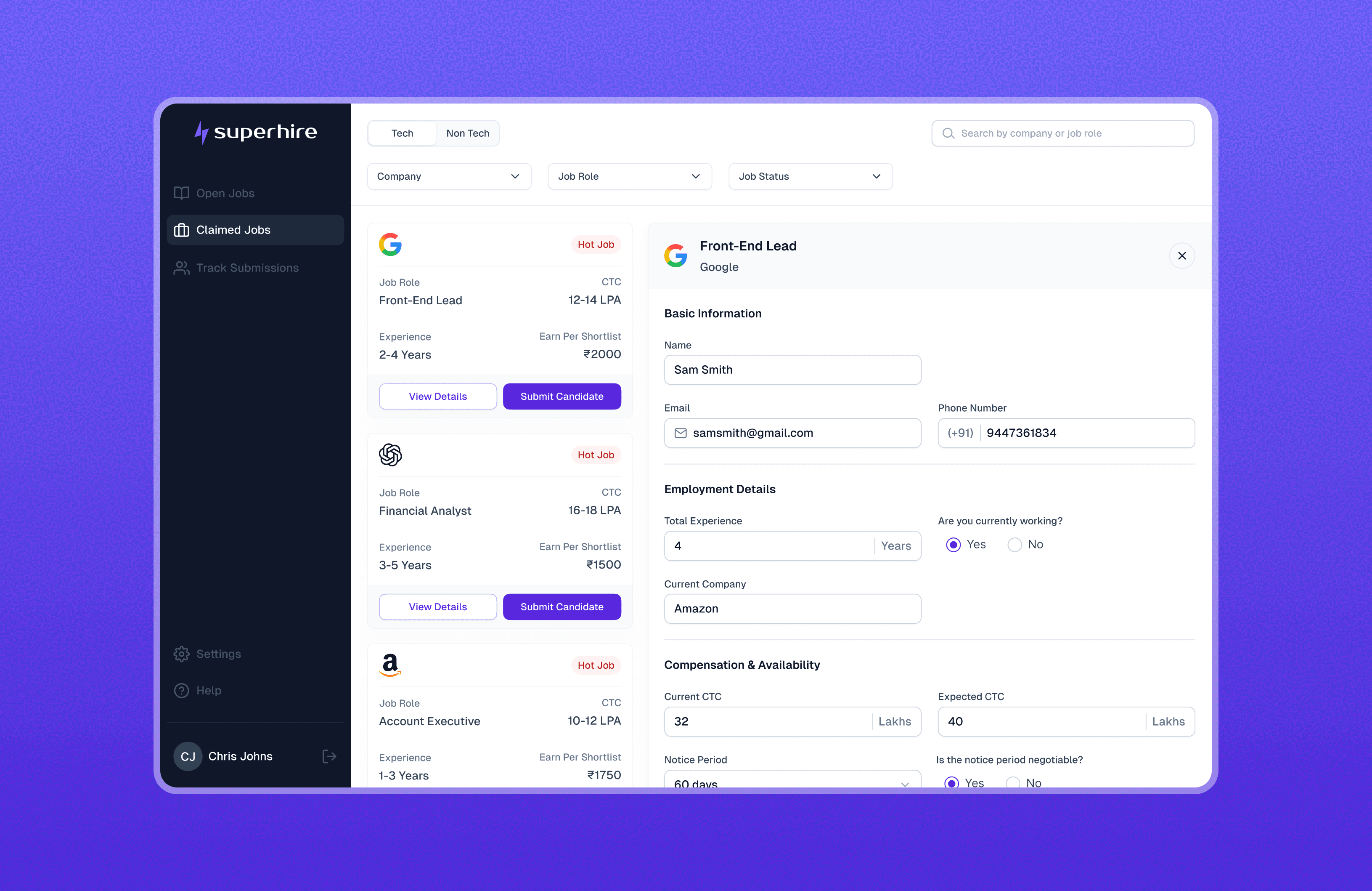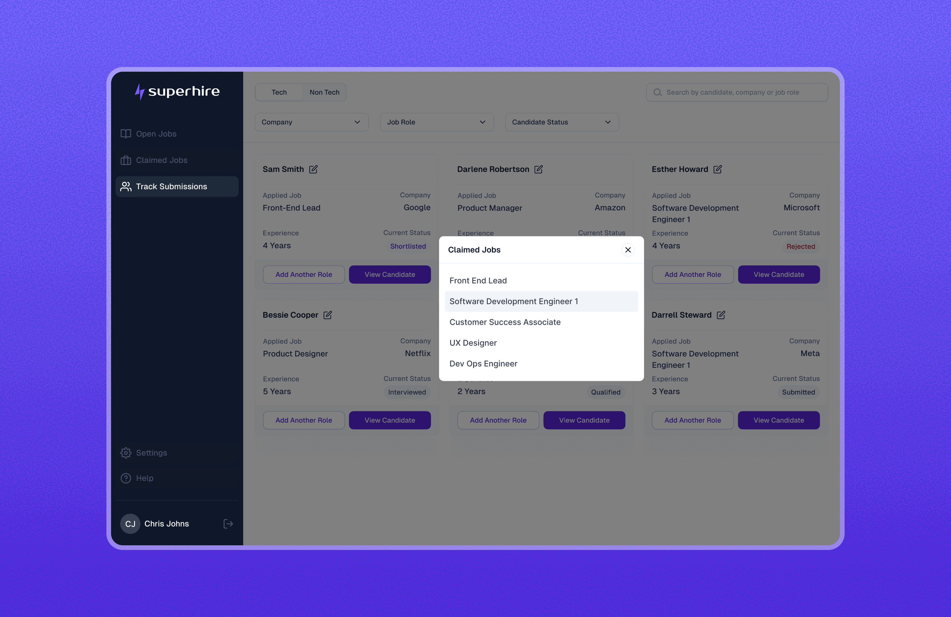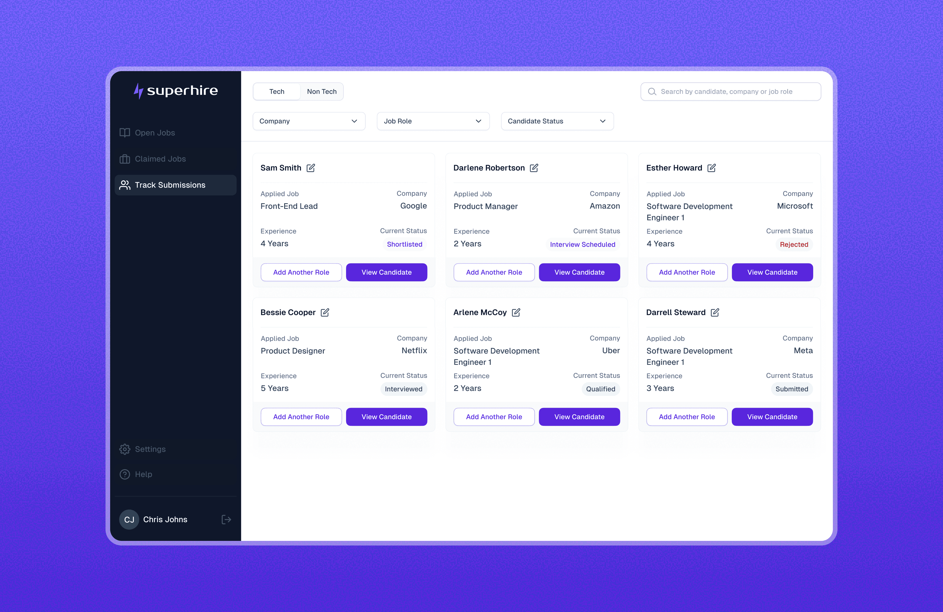 A unified view of all submitted candidates and their current status across roles.